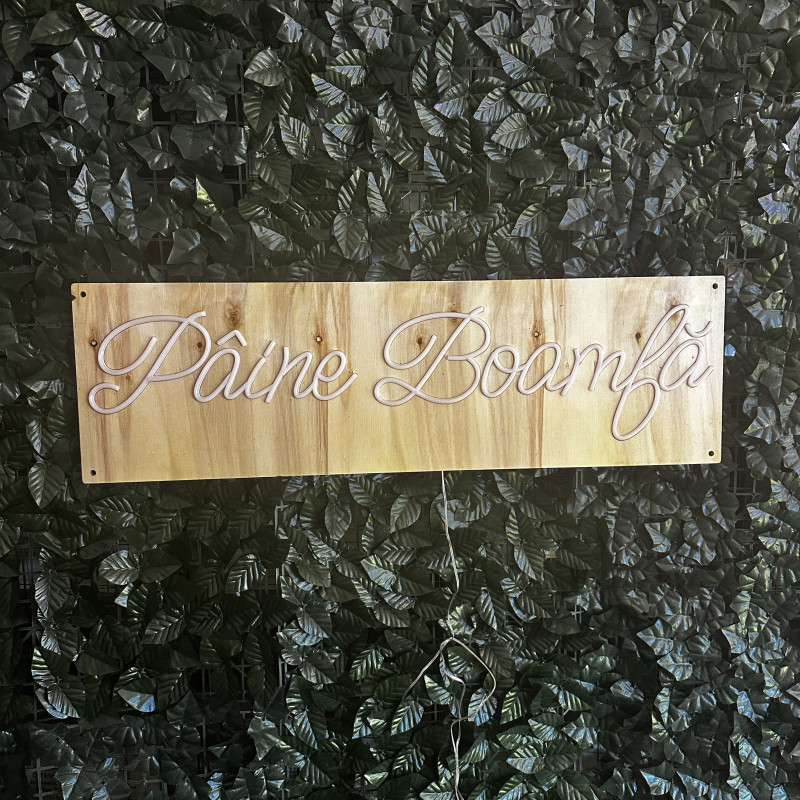 Semnul este decupat regulat și este realizat pe suport din lemn natur, pentru integrare armonioasă în decor rustic sau modern. Iluminarea este realizată cu bandă LED cu cipuri, culoare alb cald, acoperită cu silicon alb pentru lumină uniformă.