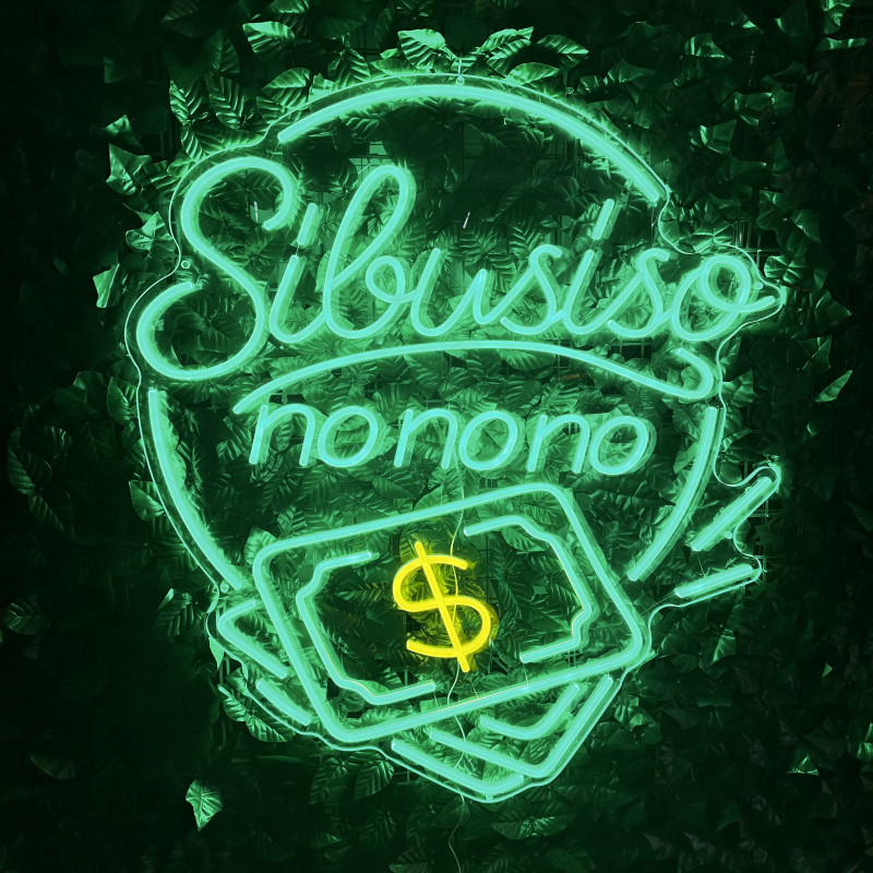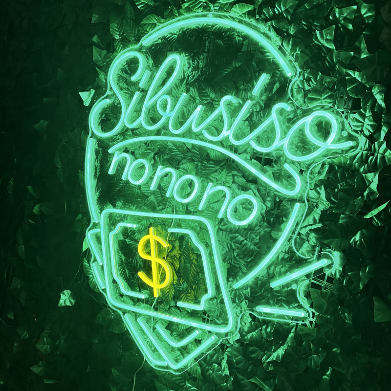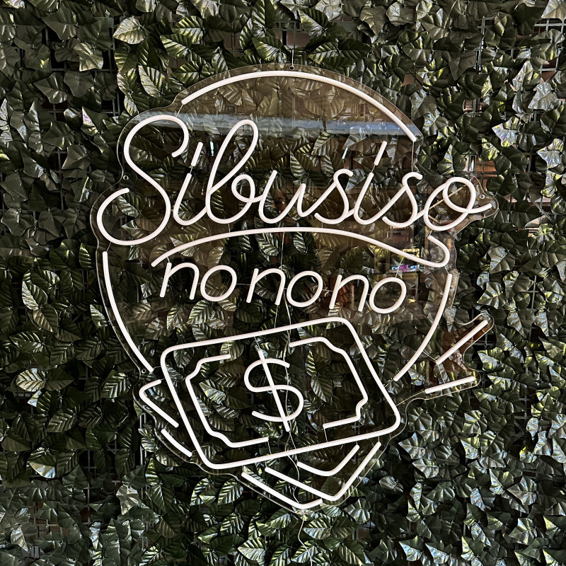 Semn luminos personalizat Sibusiso nonono, realizat de artLEDistic pentru interior, în spații comerciale și concepte cu identitate vizuală puternică. Proiectul combină textul cu elemente grafice tip bancnote.
