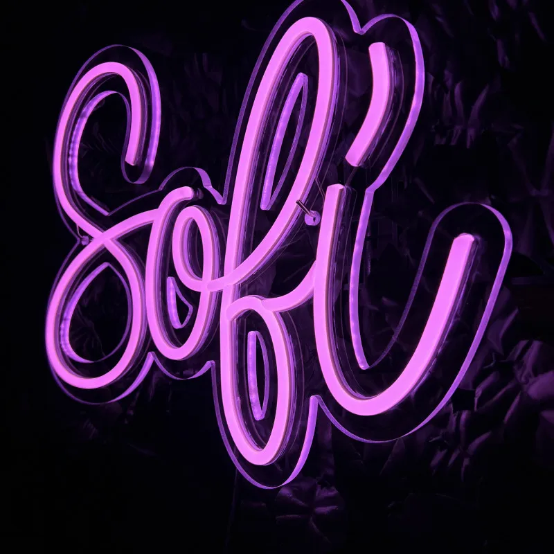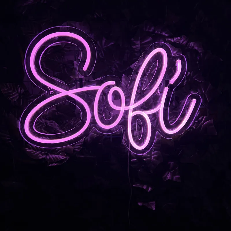 Semnul luminos LED Sofi este realizat de artLEDistic pentru utilizare la interior, cu dimensiunea de aproximativ 50 cm lungime și 34 cm înălțime și este decupat neregulat la forma textului pentru a urma conturul literelor și pentru a crea un aspect vizual curat pe perete. Iluminarea este realizată cu bandă LED cu cipuri, culoare roz deschis, acoperită cu silicon alb pentru distribuție uniformă a luminii și contur clar al literelor. Material de bază: plexiglas transparent.