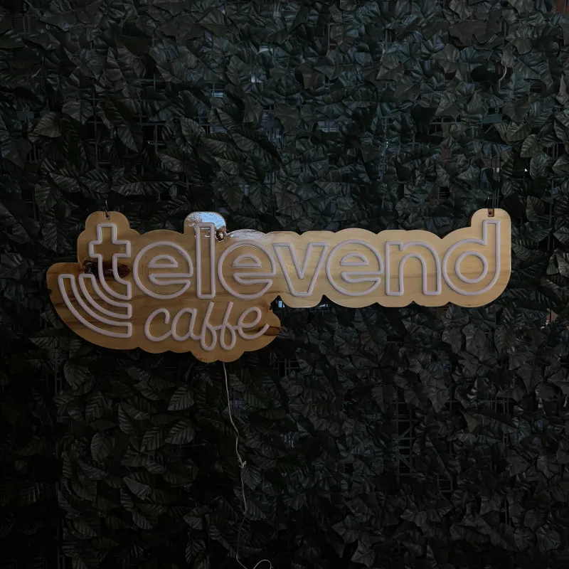 artLEDistic a realizat semnul luminos personalizat Televend Caffe pentru un spațiu dedicat cafelei și pauzelor relaxante. Designul combină iluminarea LED cu suport din lemn natur, oferind un aspect cald și modern care completează atmosfera unui coffee corner sau a unei zone de servire cafea.