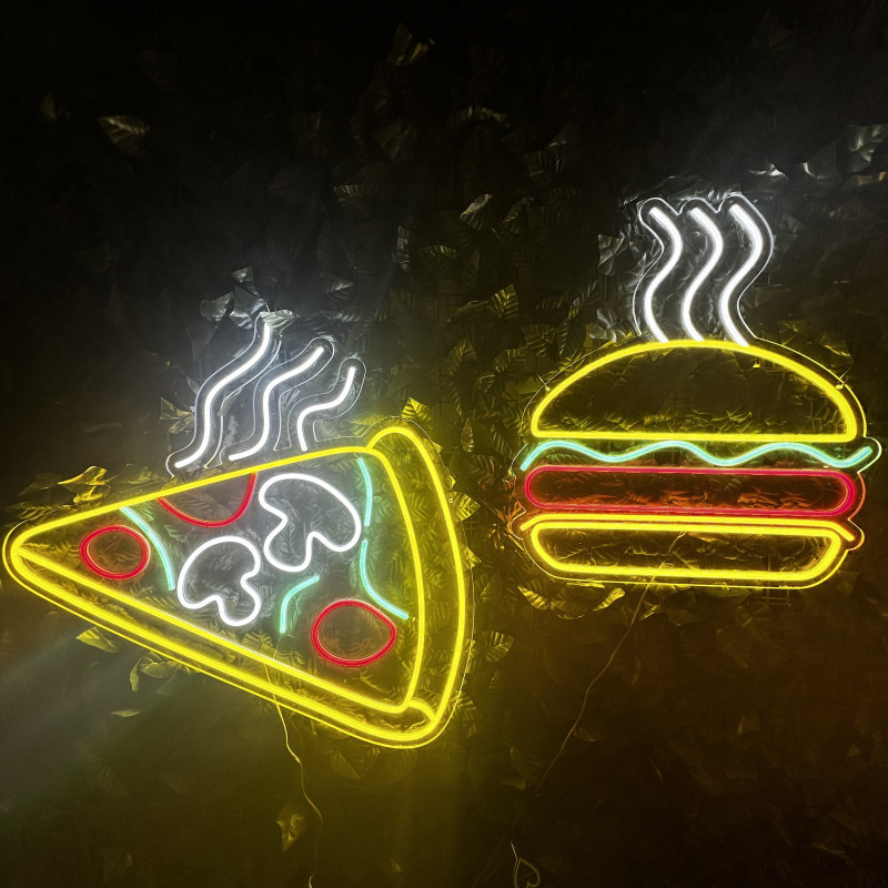 Semnele luminoase personalizate Pizza și Burger sunt realizate de artLEDistic, producător din România specializat în semne luminoase LED pentru restaurante, fast food și spații HoReCa.