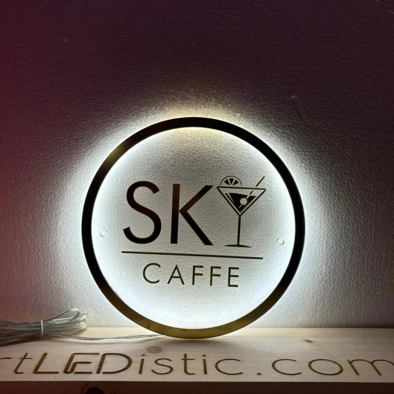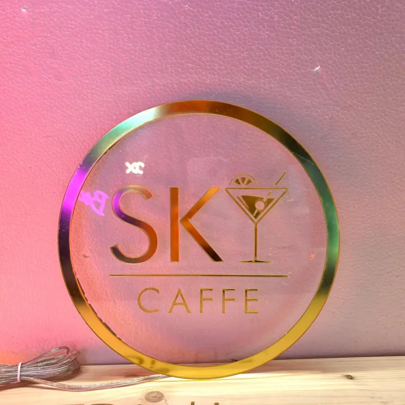 Semnul luminos „Sky Cafe” este un exemplu de eleganță modernă, combinând un design sofisticat cu materiale de înaltă calitate. Realizat din plexiglas transparent, semnul beneficiază de o iluminare subtilă pe spate, într-o nuanță pură de alb, creând un efect de strălucire delicată în jurul textului. Scrisul „Sky Cafe” este realizat din plexiglas oglindă auriu, adăugând un contrast luxos și rafinat. Această combinație de luminozitate elegantă și accente aurii reflectorizante îl face ideal pentru cafenele sau localuri moderne, aducând un plus de stil și exclusivitate decorului.