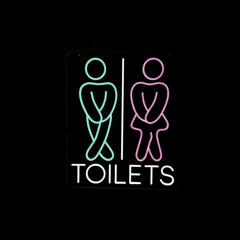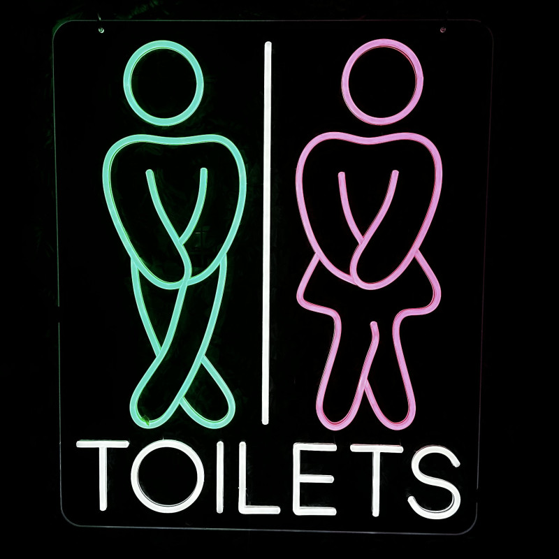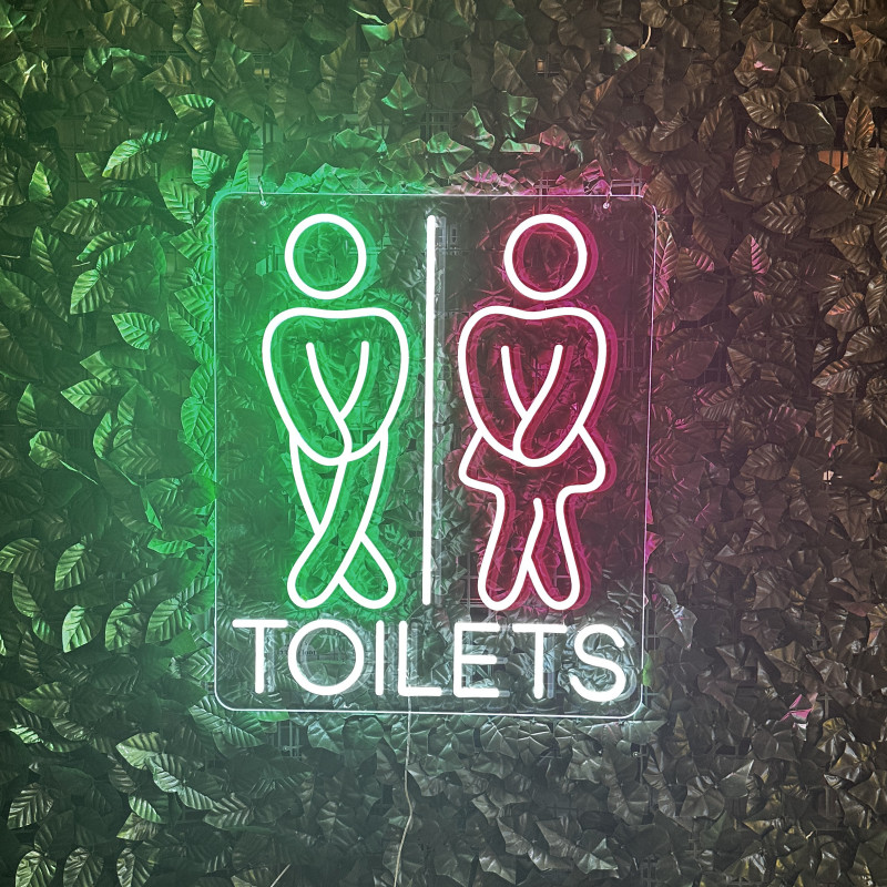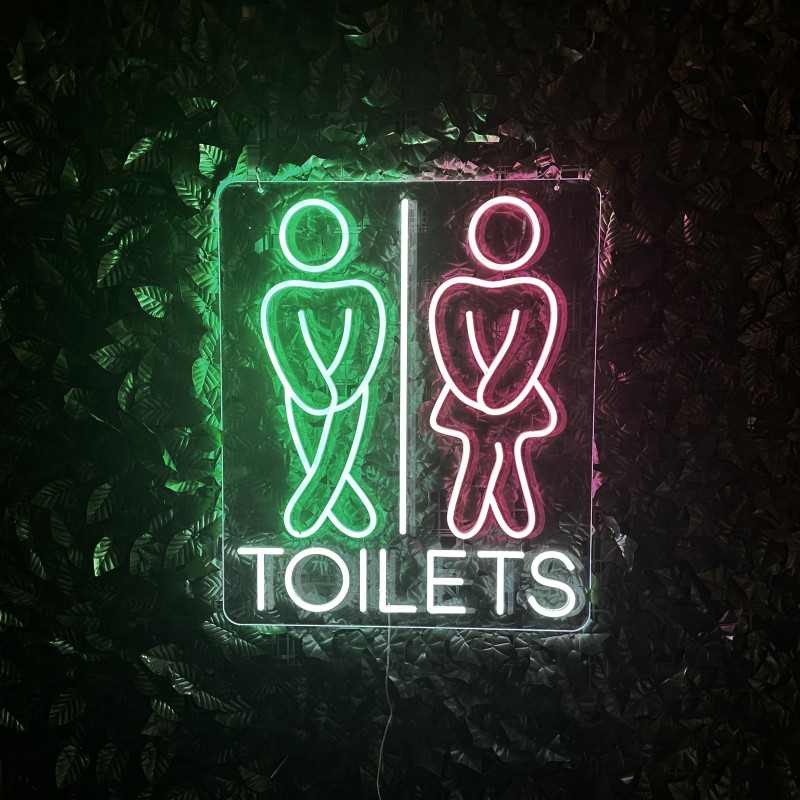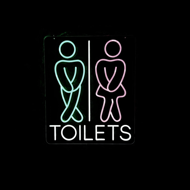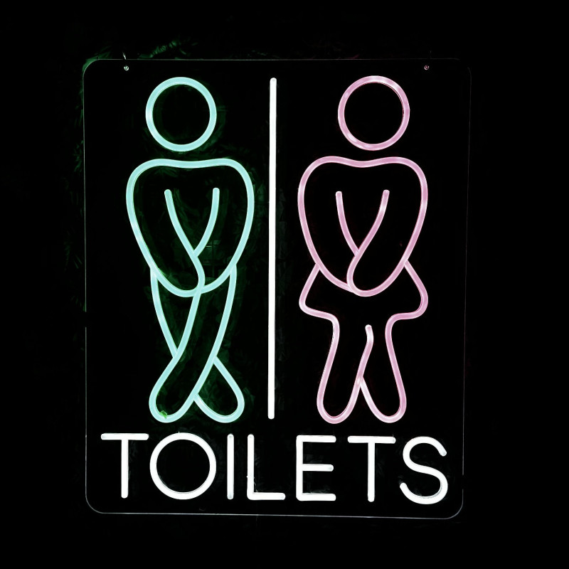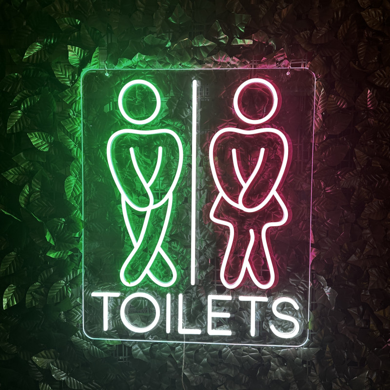 Semnul luminos „TOILETS” cu pictograme fată/băiat asigură orientare clară în spații cu trafic (restaurante, cafenele, birouri, săli de eveniment). Lumină uniformă, profil subțire, montaj curat; vizibil de la distanță și fotogenic. Personalizabil rapid (dimensiuni, culori, finisaje, limbă) și disponibil cu săgeți / iconografie ADA-like pentru fluxuri direcționale.