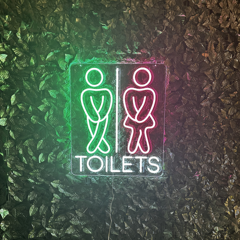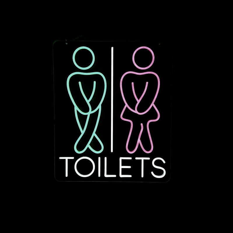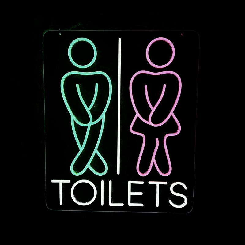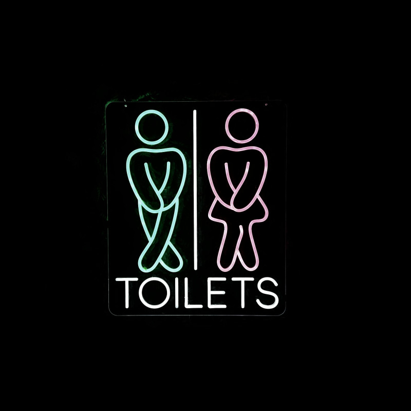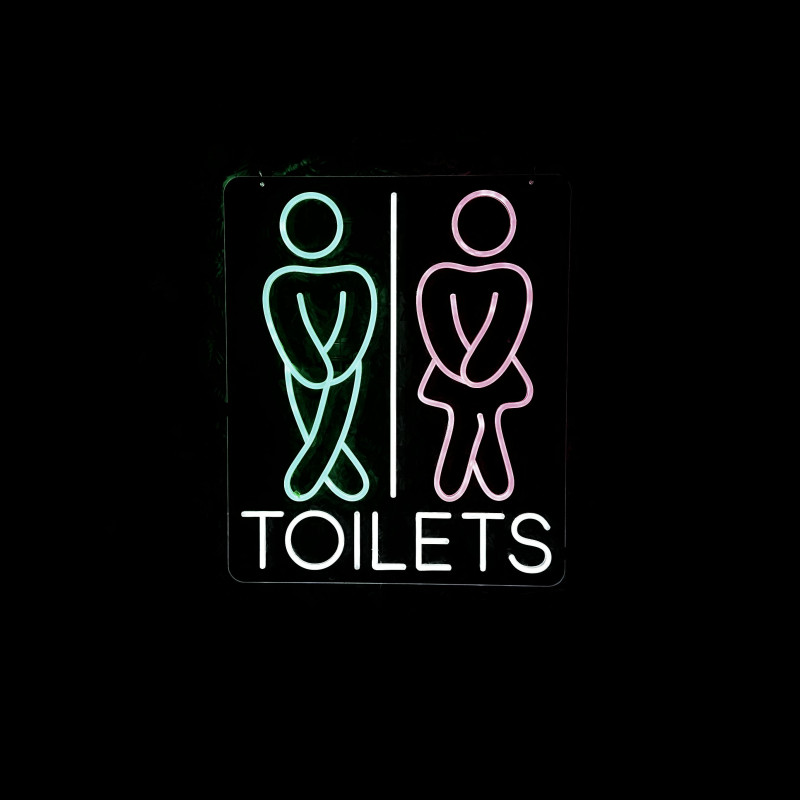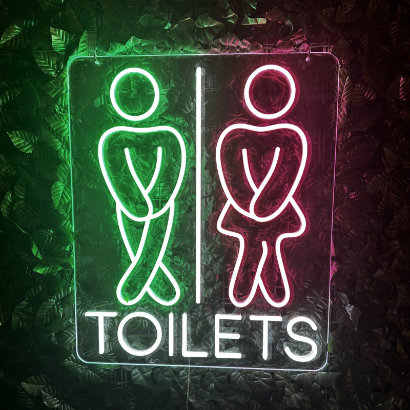 Semnul luminos „TOILETS” cu pictograme fată/băiat asigură orientare clară în spații cu trafic (restaurante, cafenele, birouri, săli de eveniment). Lumină uniformă, profil subțire, montaj curat; vizibil de la distanță și fotogenic. Personalizabil rapid (dimensiuni, culori, finisaje, limbă) și disponibil cu săgeți / iconografie ADA-like pentru fluxuri direcționale.